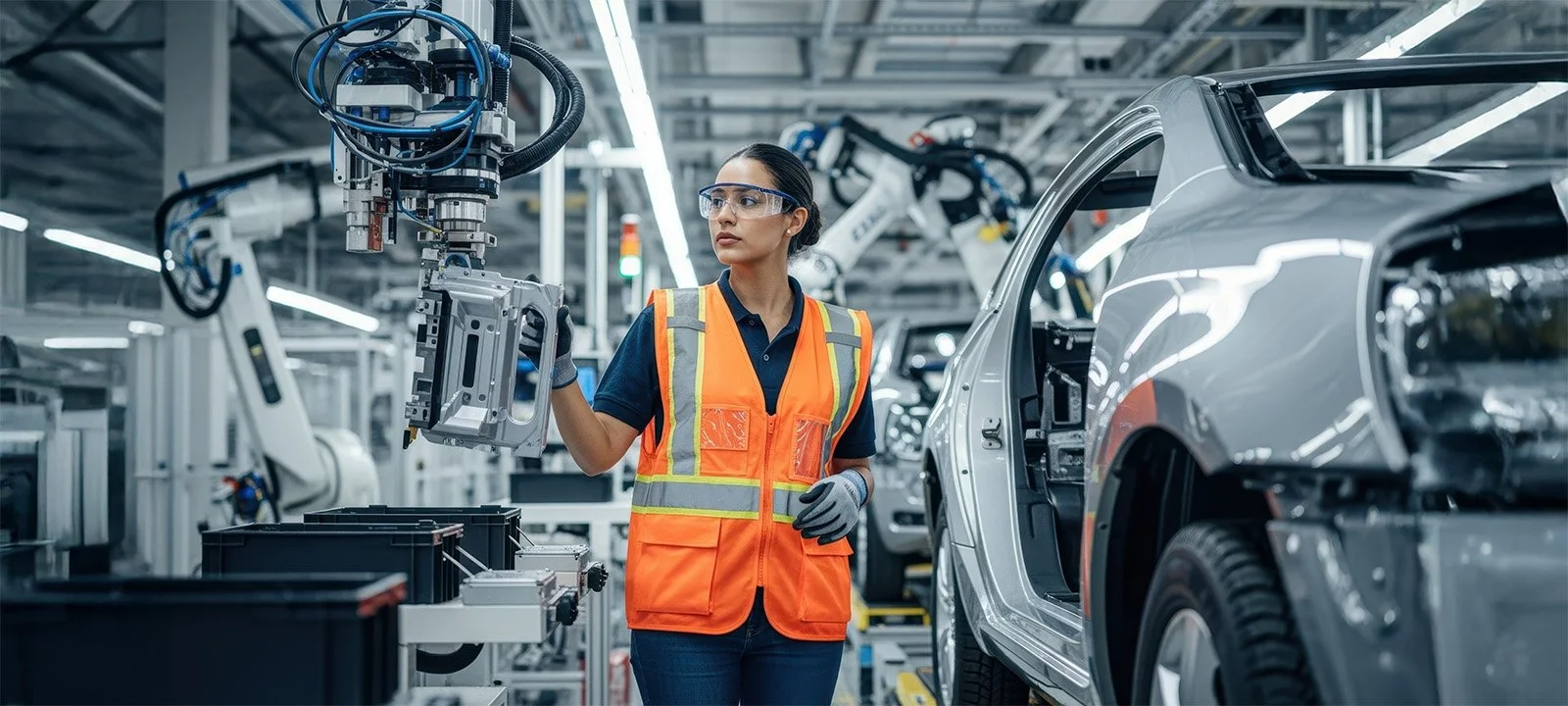 Pre-placement modules cover OSHA, NFPA 70E, hazmat, LOTO, and segment-specific SOPs—robot safety for automation lines, clean room traceability for batteries, and PIT/hazmat awareness for logistics.